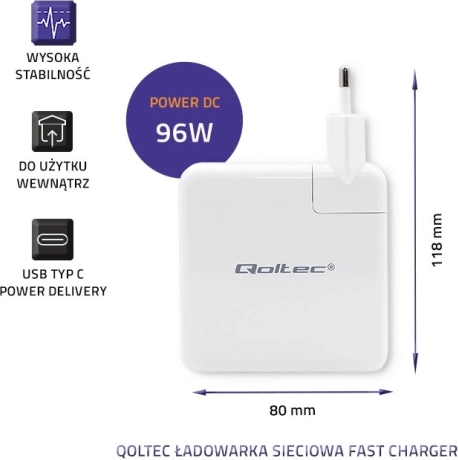 De Qoltec-oplader is uitgerust met de modernste Power Delivery-technologie, die zich aanpast aan het aangesloten apparaat en exact de maximale spanning en stroom instelt. Met een vermogen van 96W is hij veelzijdig en kan hij voor verschillende apparaten worden gebruikt.