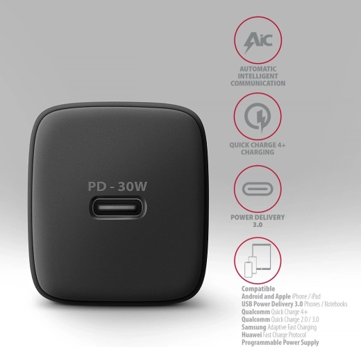 Netlader USB‑C 30W met snelladen PD 3.0/QC – zwart