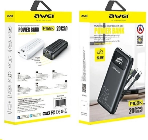 Heb je altijd en overal energie nodig? De AWEI P169K is een krachtige powerbank met 20000 mAh capaciteit die je smartphone, oordopjes of tablet herhaaldelijk kan opladen. Dankzij ondersteuning voor snel opladen tot 22,5 W vul je energie snel en efficiënt aan via de universele USB- en USB‑C‑poorten.
