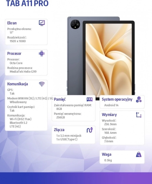 Het hart van het apparaat is de octa‑core MediaTek Helio G99 (tot 2,2 GHz), die samen met 8 GB RAM en de mogelijkheid tot virtuele uitbreiding met nog eens 8 GB zorgt voor vlotte multitasking. De opslag van 256 GB is via een microSD‑kaart uitbreidbaar tot 1 TB, zodat je genoeg ruimte hebt voor apps, media en documenten. Voor uitstekende gebruiksduur zorgt de 8800 mAh-batterij met 18W snelladen.