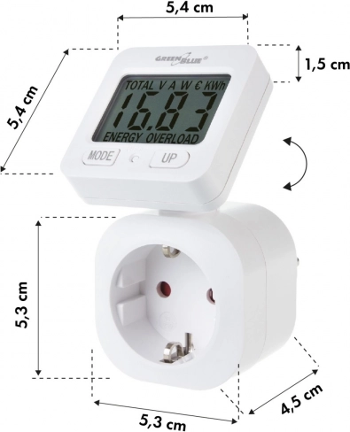 De bediening is intuïtief – er zijn 2 functietoetsen voor snel wisselen tussen modi. Het draaibare, goed leesbare display zorgt voor perfecte zichtbaarheid van de gegevens in elke positie. Het apparaat ondersteunt een belasting tot 3680 W en meet dus probleemloos ook veeleisendere apparaten zoals wasmachine, droger of pc.