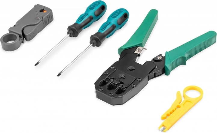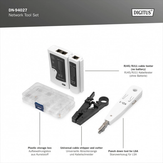 Complete set netwerkgereedschap van DIGITUS voor service en installatie van LAN. Krimpen, testen van RJ45/RJ11 en strippen in één set. Snel en betrouwbaar.