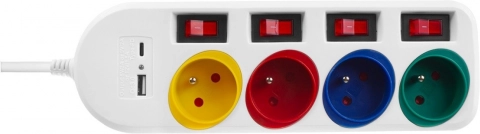 Vier gekleurde stopcontacten met kinderslot zorgen voor veiligheid in huishoudens met kinderen en maken het eenvoudig om apparaten te onderscheiden.