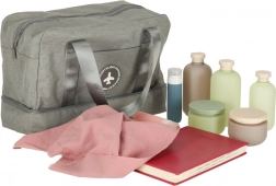 De tas heeft een grote hoofdruimte en vijf compartimenten voor kleding, cosmetica en andere kleine spullen.