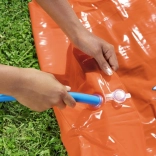 Snel en eenvoudig op te zetten. Rol de glijbaan uit op het gras en sluit de slang aan. Speciale bevestigingen zorgen ervoor dat de glijbaan stevig op zijn plaats blijft.