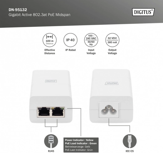 Actieve midspan PoE-injector voor gebruik binnenshuis combineert data en voeding in één ethernetkabel en vereenvoudigt de installatie van netwerkapparatuur aanzienlijk. Ondersteunt IEEE 802.3at (PoE+) met achterwaartse compatibiliteit met IEEE 802.3af, levert 52 V DC / 0,58 A uitgang (tot 30 W) en werkt met snelheden van 10/100/1000 Mb/s. Twee RJ45-poorten (LAN en PoE) maken probleemloze stroomvoorziening en gegevensoverdracht mogelijk over afstanden tot 100 meter via Cat5e/Cat6-kabel.