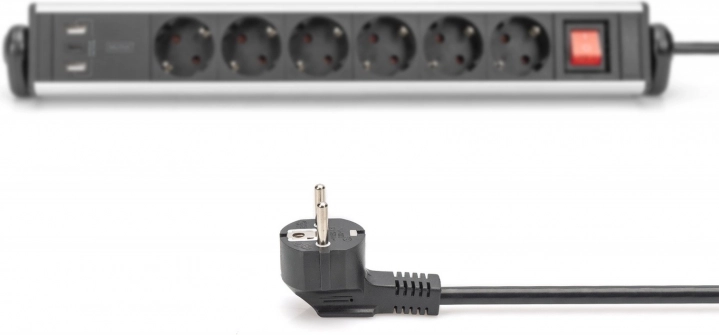 Bureau-stekkerdoos met 6 stopcontacten, 2x USB‑A en 1x USB‑C, 180° draaibaar, aluminium, met klemmen – DIGITUS