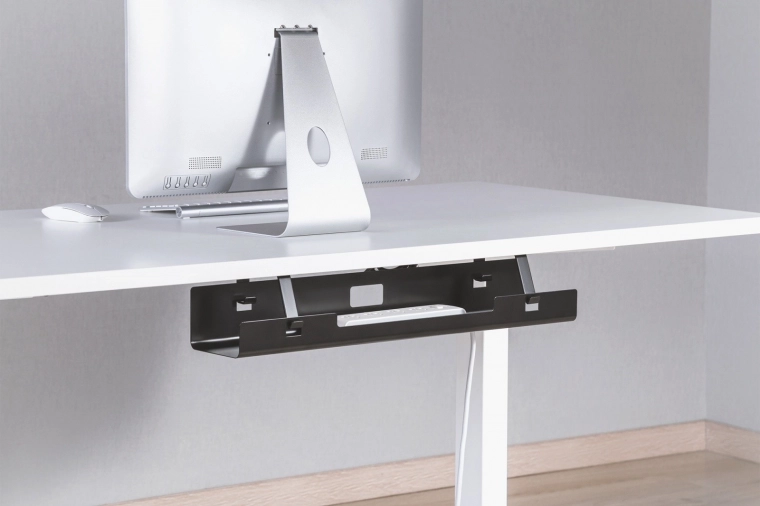 De kabelorganizer wordt eenvoudig met schroeven onder het bureau bevestigd. Dit zorgt voor een snelle en veilige installatie.