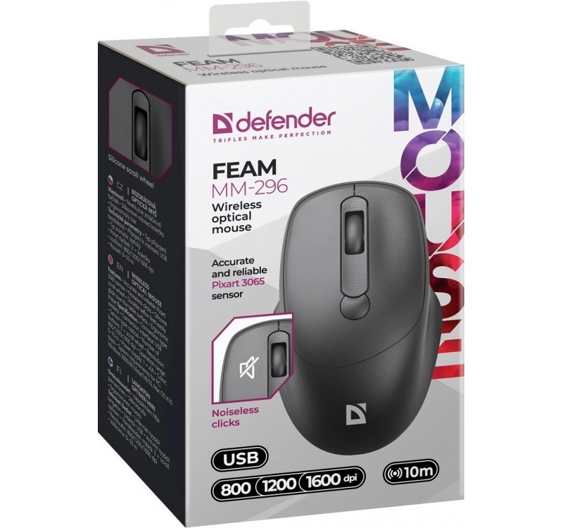 De draadloze muis DEFENDER FEAM brengt comfort en stilte naar het dagelijkse werk. Dankzij de silent click-knoppen stoort hij je omgeving niet, terwijl de ergonomische vorm zorgt voor comfortabel gebruik de hele dag. Nauwkeurige tracking tot 1600 DPI is geschikt voor regulier kantoorgebruik en websurfen.