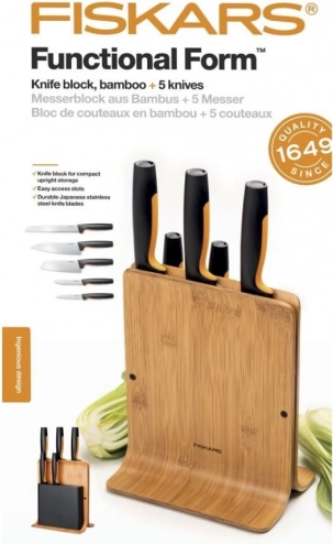 De doordachte modulaire oplossing omvat een apart vak voor kleine messen en extra ruimte voor een schaar of een extra mes. De set wordt geleverd in een milieuvriendelijke verpakking met minimaal plastic en alle onderdelen zijn eenvoudig te onderhouden – de messen zijn vaatwasmachinebestendig. Strakke lijnen en Scandinavisch (Fins) design passen perfect in een moderne keuken.