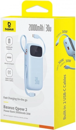 Powerbank Baseus QPow2 20.000 mAh 30 W met ingebouwde USB‑C-kabel (blauw)