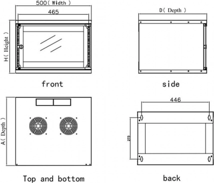 De kast is ontworpen met focus op koeling en bekabeling. Perforaties in bodem en dak maken de installatie mogelijk van tot twee 120×120 mm ventilatoren aan elke zijde, terwijl kabeldoorvoeren van 225×45 mm (boven en onder) het kabelmanagement vereenvoudigen. De deur kan worden omgezet naar links- of rechtsdraaiend, en de achterzijde is open voor gemakkelijke toegang en ventilatie.