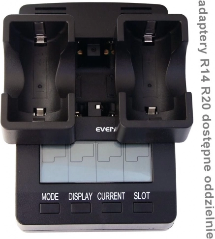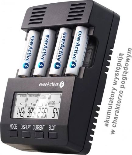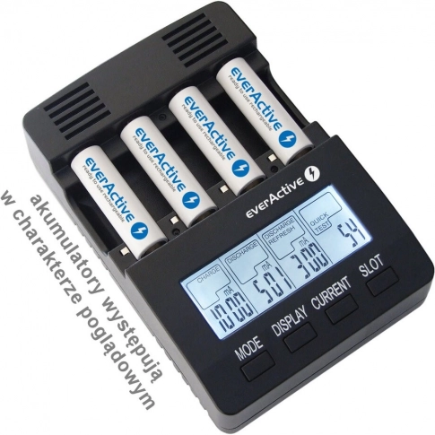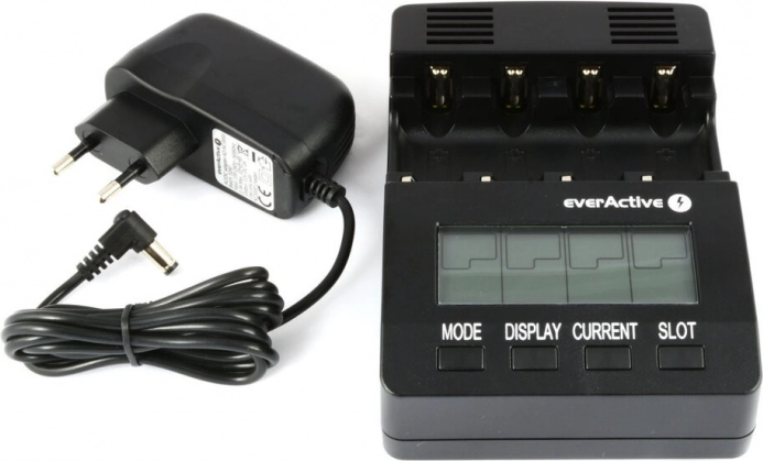 Intelligente lader EVERACTIVE NC-3000 voor AA/AAA met ondersteuning voor C/D (adapter). Modi: laden, ontladen, refresh en test; onafhankelijke sleuven; LCD-scherm.