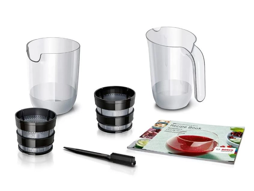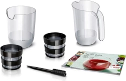 Alle kunststof onderdelen die in contact komen met voedsel zijn BPA-vrij en kunnen gemakkelijk in de vaatwasser worden gereinigd. De duurzame, zeer stille 150W motor met ongeveer 55 rpm zorgt voor een hoge sapopbrengst met minimale ruis. Ook inbegrepen is een receptenboek vol ideeën voor sappen, smoothies en gezonde drankjes.