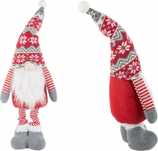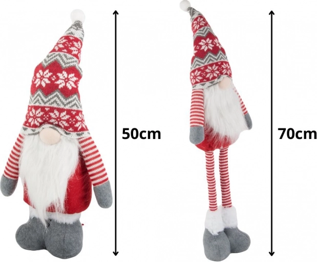 Stijlvolle Scandinavische kabouter in rode tinten met een lange gebreide muts, zachte witte baard en gestreepte mouwen is de ideale decoratie voor de winterperiode. De verstelbare hoogte van 50–70 cm laat je het figuurtje aanpassen aan de plek waar hij het beste tot zijn recht komt – van vensterbank tot schouw.