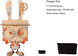 Dankzij het systeem met sleuven en lipjes past alles strak op zijn plaats. Na montage plaats je de meegeleverde kunststof bloempot met lekbak, die het meubeloppervlak beschermt. Het konijntje is perfect voor kleine bloemen, kruiden of cactussen en geeft je interieur een speelse “steampunk”-touch die kenmerkend is voor ROBOTIME.