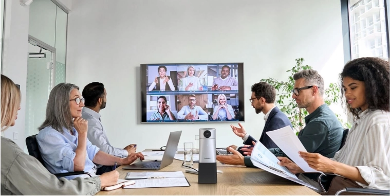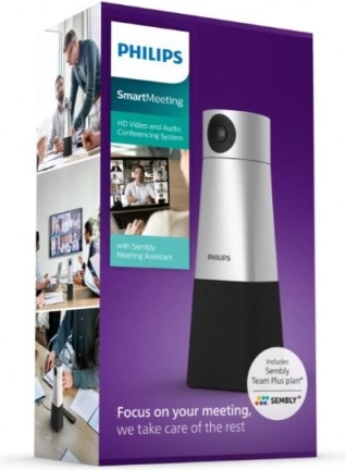 Philips SmartMeeting is een complete oplossing voor HD audio- en videoconferencing met Sembly Meeting Assistant, die zorgt voor automatische notulen, transcripties en actiepunten. De 4K-camera met stemtracking en flexibele pan/tilt/zoom legt elke deelnemer haarscherp vast, terwijl de 360° microfoon met vier microfoonarrays spraak registreert tot op 6 meter.