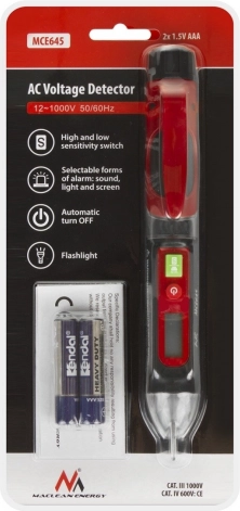 Contactloze spanningsdetector voor veilig en efficiënt meten. Detecteert spanning in het bereik van 12-1000 V, uitgerust met een achtergrondverlicht display en een ingebouwde zaklamp, wat eenvoudig gebruik garandeert, zelfs op donkere plekken.