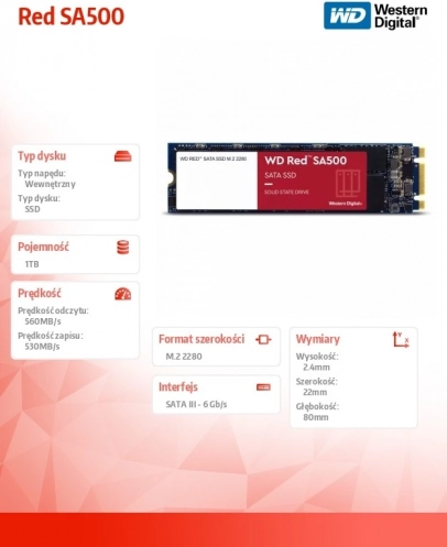 WD Red SA500 is een SATA-SSD voor NAS in het M.2 2280-formaat met een capaciteit van 1 TB, ontworpen voor continu gebruik en veeleisende omgevingen met meerdere gebruikers. Biedt snelle respons, cache-optimalisatie en hogere betrouwbaarheid zonder bewegende onderdelen – ideaal voor databases, fotobewerking en 4K/8K videomontage.