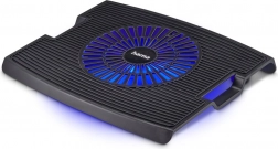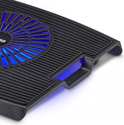 De grote centrale ventilator met blauwe LED-verlichting zorgt voor een gelijkmatige luchtstroom en snelle warmteafvoer voor stabiele laptopprestaties.