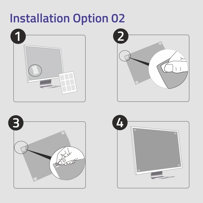 Eenvoudige installatie en hoogwaardige materialen zorgen ervoor dat uw monitor schoon en onbeschadigd blijft. De filter kan eenvoudig worden geïnstalleerd met clips die aan de monitorrand hechten of met transparante strips direct op het scherm.