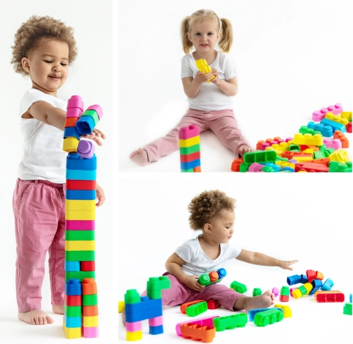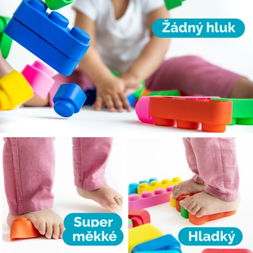 Alle blokken zijn gemaakt van zacht materiaal dat veilig is voor kinderenspel en ervoor zorgt dat kinderen zich niet bezeren tijdens het spelen.