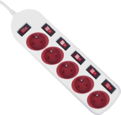 Deze robuuste verdeelstekker biedt vijf volwaardige stopcontacten met onafhankelijke tuimelschakelaars, waarmee u specifieke apparaten kunt uitschakelen zonder de stekkers los te hoeven koppelen. Het praktische ontwerp in combinatie met duidelijke rode accenten maakt dagelijks gebruik eenvoudiger.