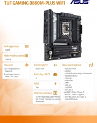 ASUS TUF GAMING B860M‑PLUS WIFI is gebaseerd op de Intel B860-chipset en biedt robuuste voeding, hoogwaardige koeling en een lange levensduur. Dankzij ondersteuning voor DDR5 tot 8800 MHz en een maximale capaciteit van 256 GB levert het soepele prestaties voor veeleisende games, multitasking en creatieve toepassingen.