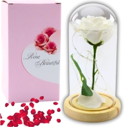 Eeuwige witte roos onder glazen koepel met LED-verlichting is het ideale cadeau voor wie elegantie en symboliek waardeert. Deze kunstroos, die een natuurlijke bloem perfect nabootst, verwelkt nooit en ziet er altijd fris uit. Onder een glazen koepel en verlicht door zacht LED-licht, creëert zij een romantische sfeer die ideaal is voor bijzondere momenten.