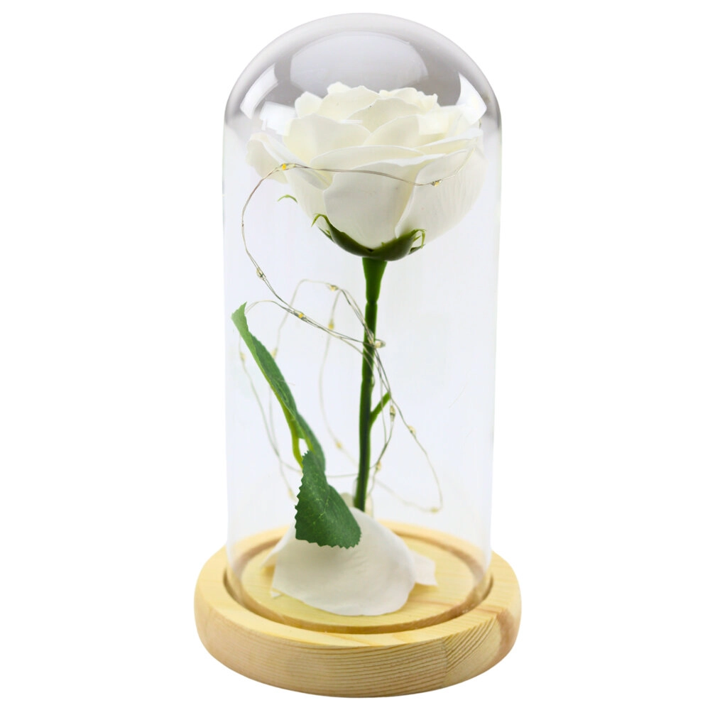 Eeuwige witte roos onder glazen koepel met LED-verlichting