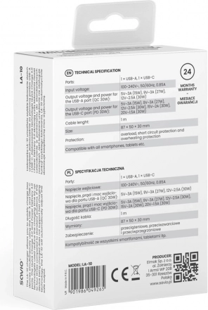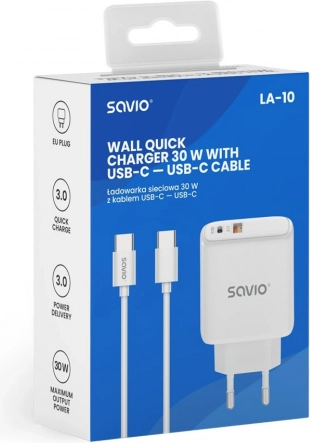 De compacte Savio‑netlader met een vermogen van 30 W biedt snel laden via Power Delivery en Quick Charge 3.0 voor smartphones, tablets en geselecteerde laptops. In de verpakking zit een duurzame USB‑C ↔ USB‑C‑kabel van circa 1 m, zodat je direct kunt beginnen met laden. Dankzij twee poorten (USB‑C en USB‑A) en geavanceerde bescherming is hij ideaal voor thuis, op kantoor en onderweg.