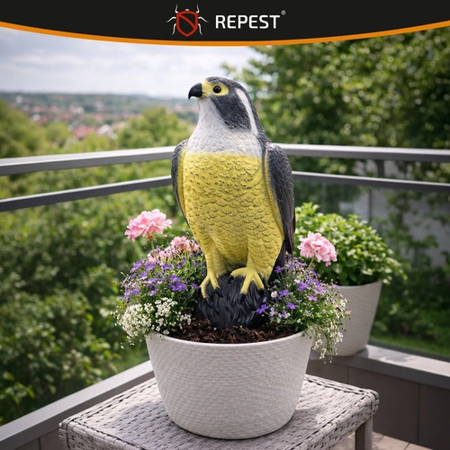 Realistische vogelverjager in de vorm van een havik beschermt effectief balkons, terrassen en tuinen. Dankzij het gedetailleerde ontwerp en de natuurlijke kleuring werkt hij als een natuurlijke roofvogel en weert betrouwbaar duiven, spreeuwen, mussen, kauwen en meeuwen af. Hij is UV- en weerbestendig, kan met zand worden verzwaard voor extra stabiliteit en is eenvoudig te verplaatsen naar behoefte.
