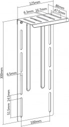Universele compatibiliteit met standaard VESA-gaten van 100x100 mm garandeert een eenvoudige installatie. In hoogte verstelbaar en met de mogelijkheid om de plank voorwaarts of achterwaarts te monteren, zodat je de positie van het bevestigde apparaat aan je behoeften kunt aanpassen.