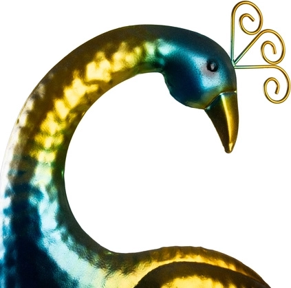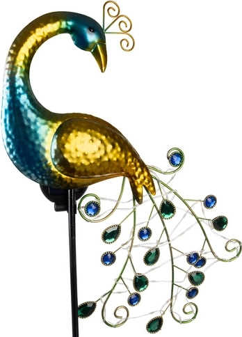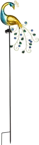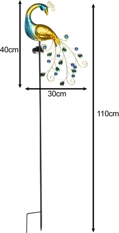 Zonne-energielamp in de vorm van een pauw is de ideale oplossing voor betrouwbare verlichting van tuin of terras. Energiebesparing dankzij het zonnepaneel en automatisch in- en uitschakelen bij zonsopgang en zonsondergang.