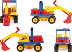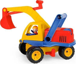 Kleurige graafmachine voor kinderen van 35 cm met een draaibare bovenbouw, functionele arm en een chauffeurfiguur in de cabine. Voorzien van 2 assen, vergrendeling van de draaiing en een praktisch handvat achter de cabine voor eenvoudig bedienen – ideaal voor de zandbak en voor binnen spelen.