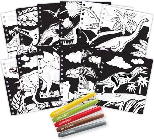 Ontdek de creatieve set voor kleine paleontologen: fluwelen kleurplaten DINOSART met de wereld van dinosaurussen. De set bevat 12 magische fluwelen platen, 5 mini stiften, duidelijke instructies en informatieve pagina’s over dinosaurussen – ideaal voor plezier en leren zonder over de lijnen te kleuren.