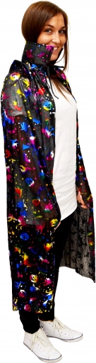 Stijlvolle mantel voor kleine tovenaars en heksen, gemaakt van glanzend materiaal met een print van kleurrijke pompoenen. Heeft een comfortabele kraag en striksluiting met koord bij de hals voor eenvoudig aantrekken. Lengte 120 cm is ideaal voor kinderkostuums voor carnaval, Halloween en themafeesten.