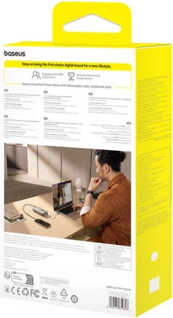 De krachtige BASEUS Free2Pull‑powerbank levert snel en betrouwbaar opladen met een vermogen tot 65 W en kan daardoor overweg met moderne telefoons, tablets en kleinere laptops met USB‑C. De grote capaciteit van 20.000 mAh biedt meerdere oplaadbeurten en het geïntegreerde LED‑display toont op elk moment het exacte percentage resterende energie.