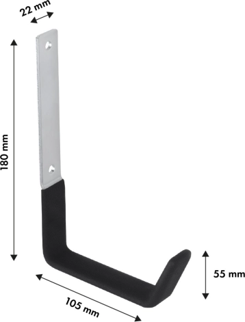 De montage is snel en eenvoudig – de plaat met twee montageopeningen zit stevig aan de muur en de haak kan dagelijkse belastingen aan. Praktische afmetingen 180 × 105 × 55 mm en het ergonomisch gevormde, gerubberde deel van de haak verhogen de veiligheid en het gebruikscomfort.