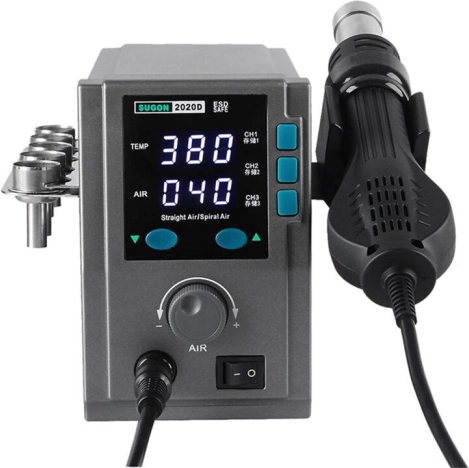 Ervaar de professionele prestaties van het SUGON hetelucht-soldeerstation, ontworpen voor vakmensen en enthousiaste doe-het-zelvers in elektronica. Het biedt uitgebreide mogelijkheden voor het regelen van temperatuur en luchtstroom, waardoor het ideaal is voor verschillende soldeertaken.