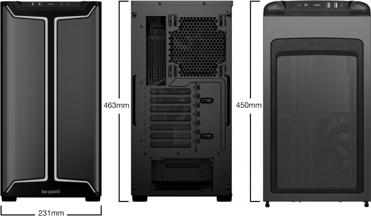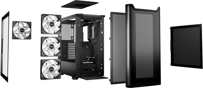 Het mesh‑front en het bovenpaneel ondersteunen een sterke luchtstroom. Drie voorgeïnstalleerde Pure Wings 3 140 mm PWM‑ventilatoren leveren hoge luchtdruk bij een laag geluidsniveau.