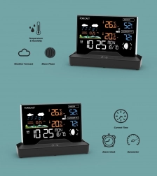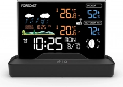 Modern draadloos weerstation met kleurendisplay biedt nauwkeurige meting van temperatuur en luchtvochtigheid binnen en buiten, een barometer voor luchtdruk, radiogestuurde klok met alarm en een weersvoorspelling voor 12–24 uur. Dankzij de draadloze sensor tot 30 m en instelbare achtergrondverlichting lees je waarden eenvoudig af, zowel overdag als ’s nachts.