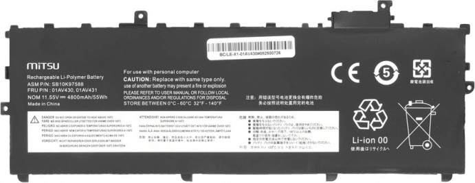 Betrouwbare vervangende MITSU-batterij voor LENOVO ThinkPad X1 Carbon (5e en 6e generatie, jaren 2017–2018) met een capaciteit van 4800 mAh (55 Wh) en een spanning van 11,55 V. Uitblinker door de werkelijk opgegeven capaciteit, lagere zelfontlading, zonder geheugeneffect en meervoudige beveiliging tegen overladen, oververhitting en kortsluiting.