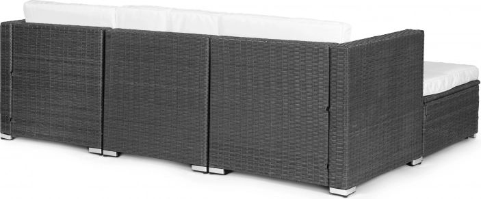Stijlvolle modulaire tuin-hoekzitset van technorattan MULTIGARDEN in het grijs met een modulaire constructie van 4 delen, een duurzaam stalen frame en een tafeltje met gehard glas voor comfortabel ontspannen en gezellige momenten met vrienden. Polyester kussens (160 g/m²) en weerbestendigheid zorgen voor eenvoudig onderhoud en een lange levensduur.