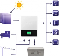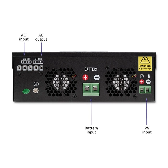 Deze hybride zonne-omvormer biedt een optimale oplossing voor off-grid benutting van zonne-energie. Hij zet gelijkstroom om in wisselstroom en garandeert zo de voeding van uw huishoudelijke apparaten, zelfs bij stroomuitval.