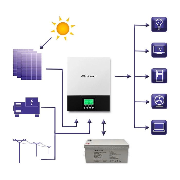 De omvormer is uitgerust met een intelligent laadsysteem dat de accu beschermt tegen overbelasting en zorgt voor optimale prestaties. Via het scherm kunt u de invoerspanning en laadstroom naar wens configureren.