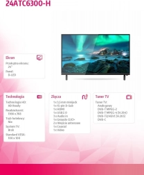 Compacte LED-televisie met een beelddiagonaal van 24"; ideaal voor kleinere ruimtes, keukens of slaapkamers. Biedt zuinig gebruik, scherp beeld en eenvoudige bediening. Dankzij de compacte afmetingen en lichte constructie plaats je hem bijna overal en geniet je comfortabel van je favoriete programma’s. Geniet van een helder beeld, laag energieverbruik en eenvoudige installatie in het dagelijks gebruik.