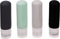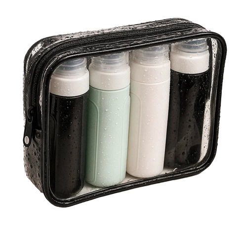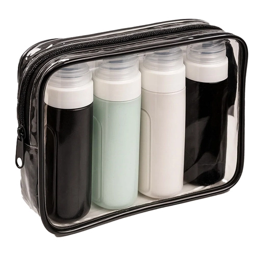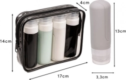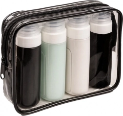 Reis-cosmeticaset met vier flexibele flesjes die voldoen aan de eisen van de luchtvaart, waterdicht en ideaal voor in het vliegtuig zijn. Biedt comfort en organisatie onderweg.