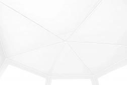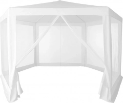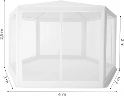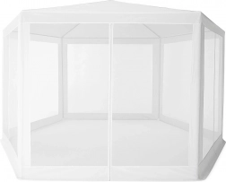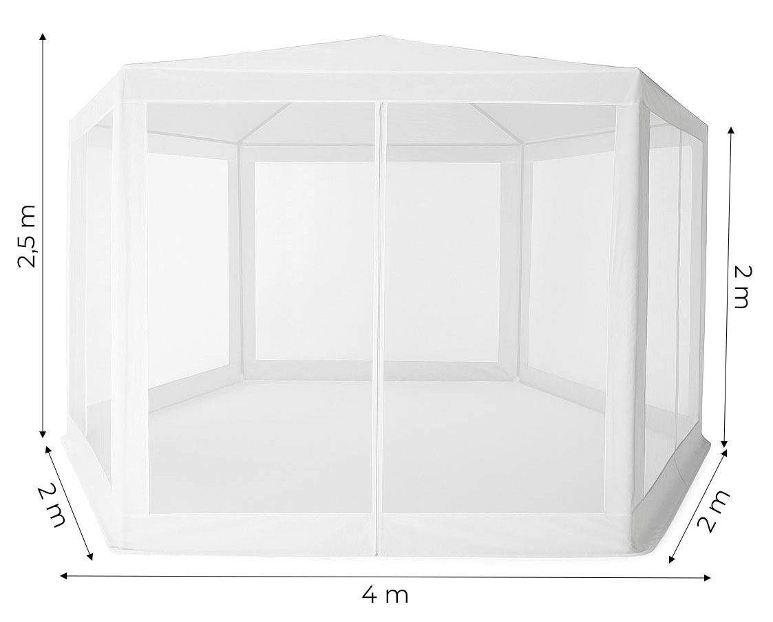 De stabiele metalen constructie en zes wanden met muggennet zorgen voor comfortabel en veilig gebruik. De praktische ritssluiting biedt snelle toegang tot het interieur van het paviljoen.