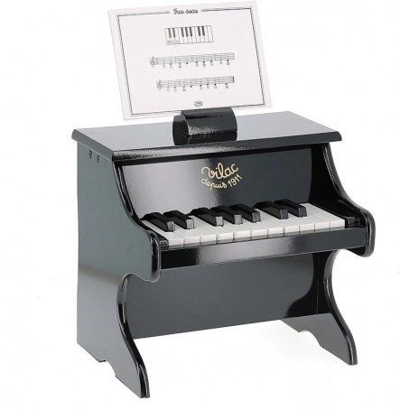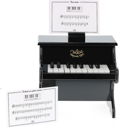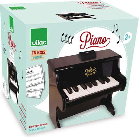 Houten kinderpiano VILAC in zwart, 18 toetsen, 10 pagina’s bladmuziek. Perfect voor de eerste speelmomenten en het ontwikkelen van muzikaal talent. Voor kinderen vanaf 3 jaar.